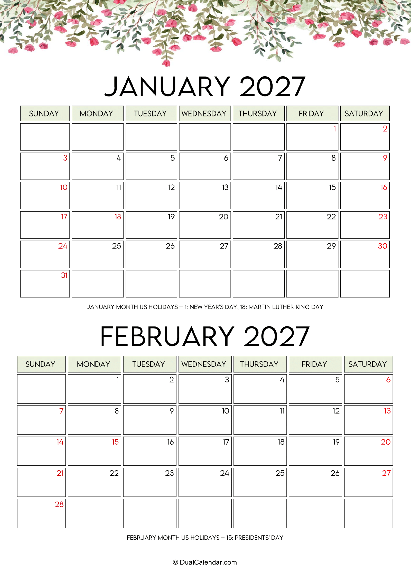 Good time management is key to success. When you have both January and February 2027 calendars together, you can plan your time more smartly. It not only boosts your productivity but also reduces stress.